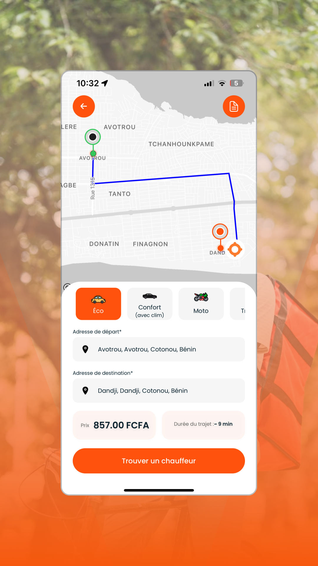 Commandez un chauffeur en moto ou voiture. Arrivez en quelques minutes.